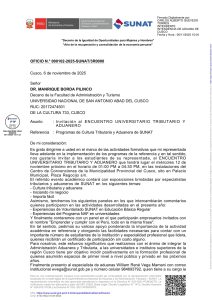 La Superintendencia Nacional de Aduanas y de Administración Tributaria (SUNAT) invita a los estudiantes de la Escuela Profesional de Ciencias Administrativas de la UNSAAC a participar en el Encuentro Universitario Tributario y Aduanero, que se llevará a cabo el miércoles 12 de noviembre de 2025, de 1:00 p.m. a 4:30 p.m., en el Centro de Convenciones de la Municipalidad Provincial del Cusco.